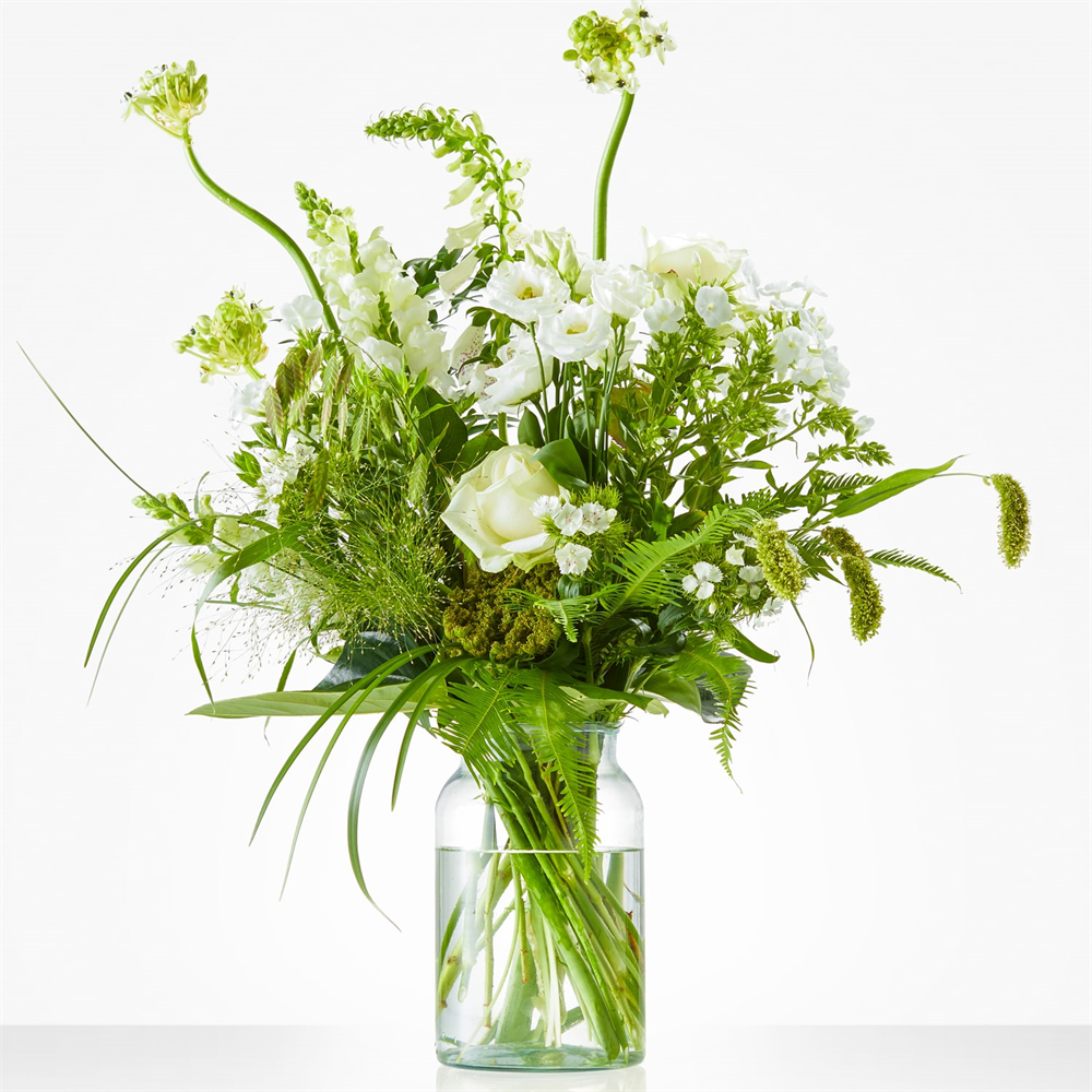 Wie denkt dat witte bloemen saai zijn, heeft het mis. Deze combinatie van de mooiste witte bloemen, laat zien dat een wit boeket ook prachtig kan zijn. Wie verras jij? Excl. vaas.
